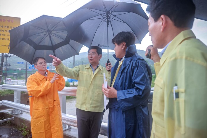이 시장은 고기교 주변의 차수벽 설치 상황을 살피고 "차수벽 콘크리트가 다 굳지 않아 거푸집을 떼지 않은 상태인데 비가 계속 내려 차수벽 쪽으로 물이 차오를 경우 차수벽이 훼손되어 제 기능을 다 못할 가능성이 있느냐"고 관계자들에게 물었다.