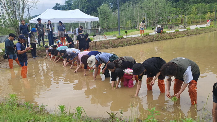 수원시는 8일 영흥수목원 논 전시원에서 토종벼를 심는 ‘한반도 16도 토종벼 논 정원’ 모내기 행사를 진행했다.