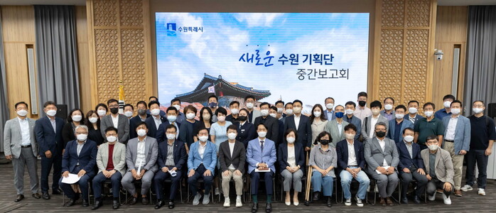 사진/새로운 수원 기획단 위원들이 중간보고회 후 함께하고 있다.(사진제공=수원시)