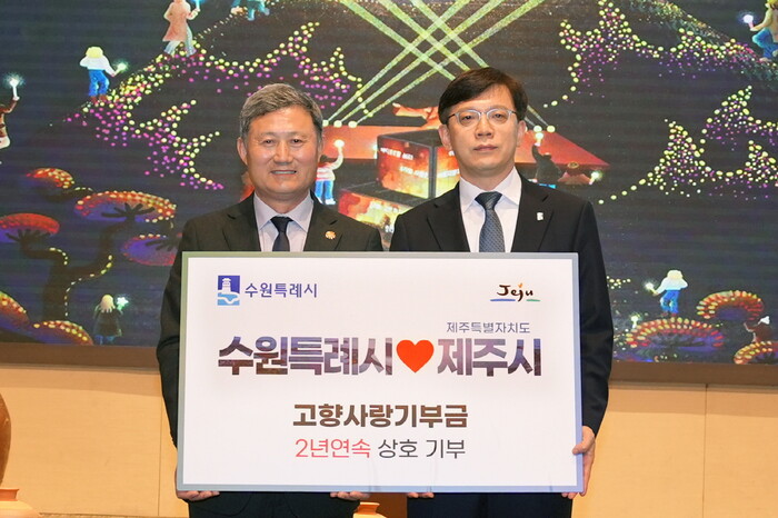 수원시(시장 이재준)가 자매도시인 제주시와 ‘고향사랑 상호기부식’을 열고, 협력을 약속했다.