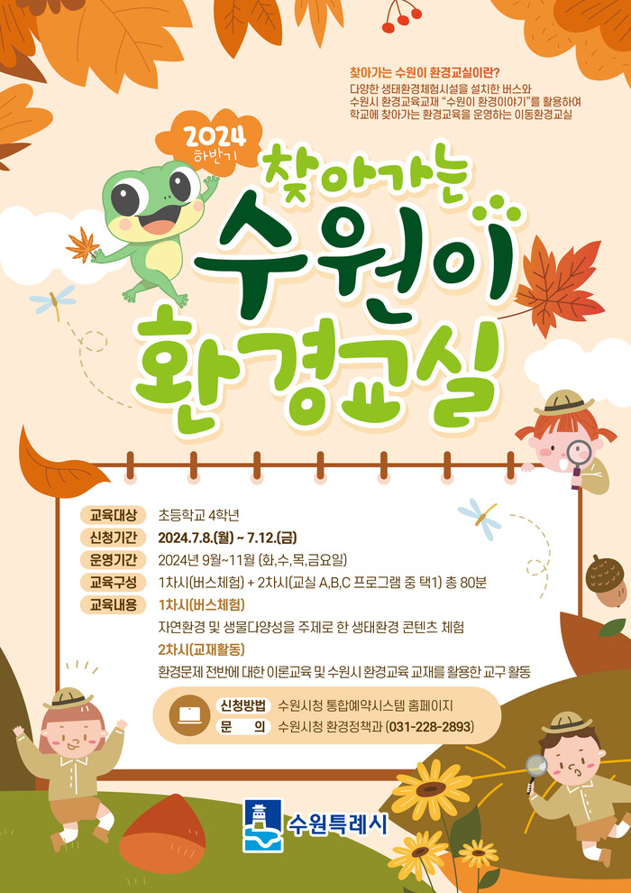 수원시(시장 이재준)가2024년 하반기 찾아가는 수원이 환경교실에 참여할 64개 학급을 8일부터 12일까지 모집한다.