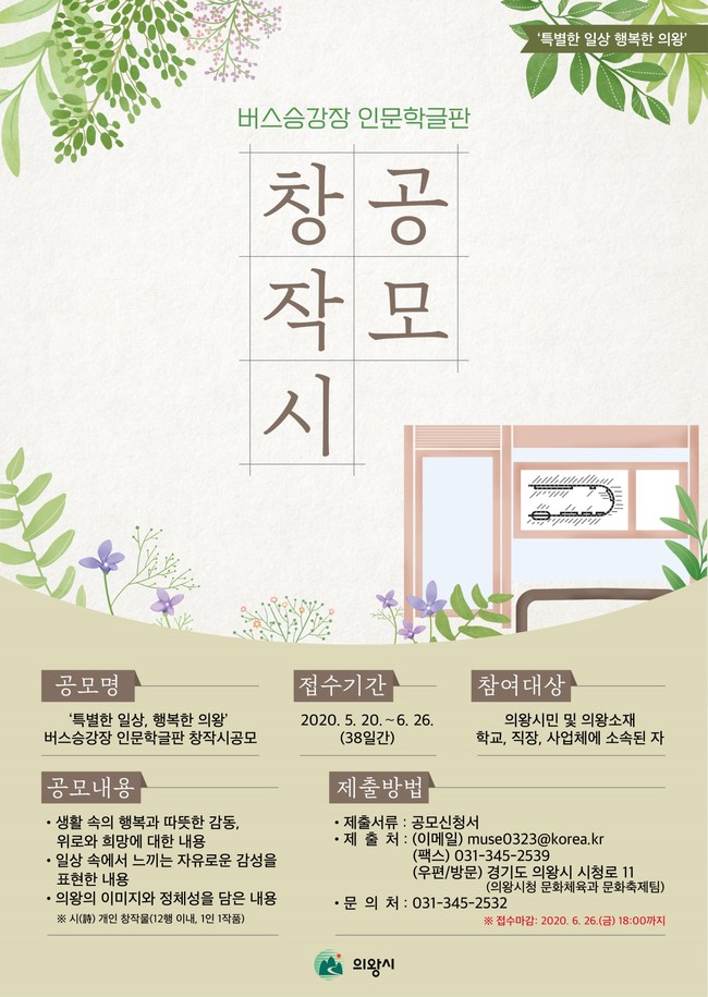 공모 내용은 일상 속에서 느끼는 자유로운 감성을 표현한 내용, 생활 속의 행복과 따뜻한 감동, 위로와 희망에 대한 내용을 담은 12행 이내의 창작시로, 의왕시민 또는 의왕시 소재 학교와 직장에 소속된 분들이면 누구나 응모 가능하다.