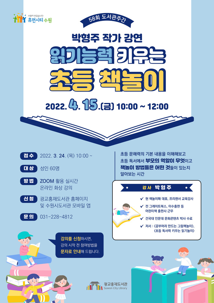 수원시 광교홍재도서관이 박형주 작가 강연 ‘읽기능력 키우는 초등 책놀이’ 수강생 60명을 선착순으로 모집한다.