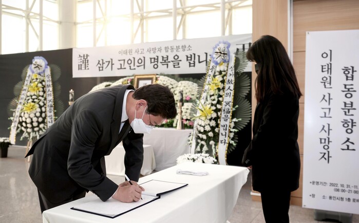 이상일 용인특례시장은 조문록에 "이태원에서 희생된 분들의 명복을 빕니다. 비통한 마음 금할 길 없습니다. 전국 어디에서든 다시는 이런 일이 발생하지 않기를 기도합니다. 용인에서도 시민 안전에 만전을 기하겠습니다“라고 적었다.