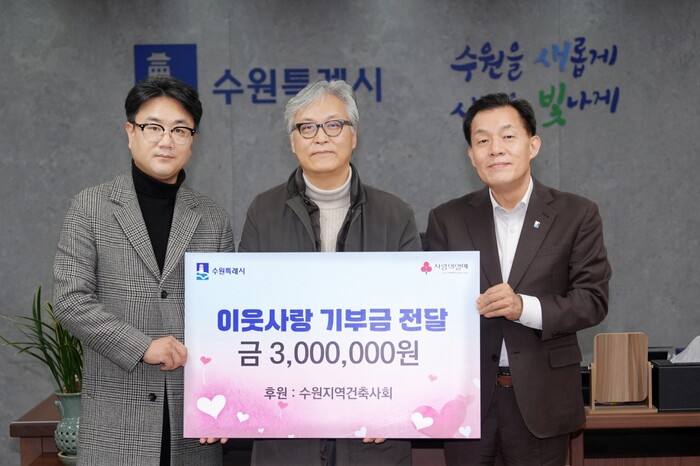 이웃돕기성금 300만 원은 수원지역건축사회 회원 137명이 모금해 마련했다. 수원지역건축사회는 2024년에도 이웃돕기성금 300만 원을 기부한 바 있다.