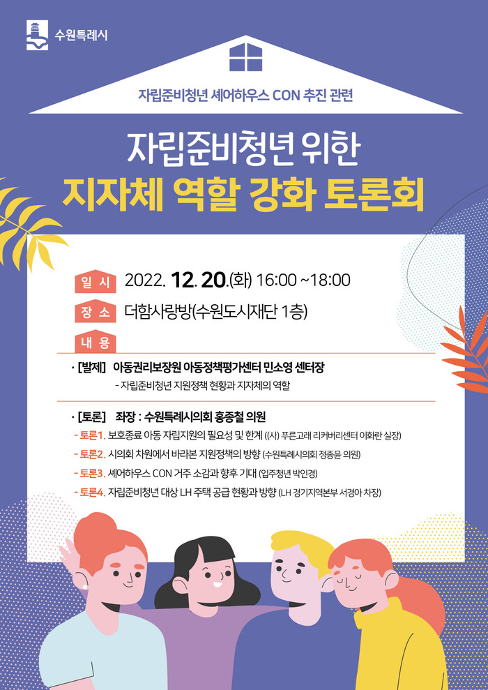 수원시가 12월 20일 오후 4시 수원도시재단 1층 더함사랑방에서 ‘자립 준비 청년 위한 지자체 역할 강화 토론회’를 개최한다.