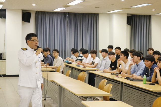 ‘세종대’(총장 신 구)는 올해로 23번째인 바다의 날(5.31)을 맞아 강동석 명예해군을 초청하여 “목표, 도전, 최선”을 주제로 미래 해군장교가 될 국방시스템 공학과 학생들에게 인생에 대한 도전정신과 해양의 중요성에 대한 강의를 진행했다.