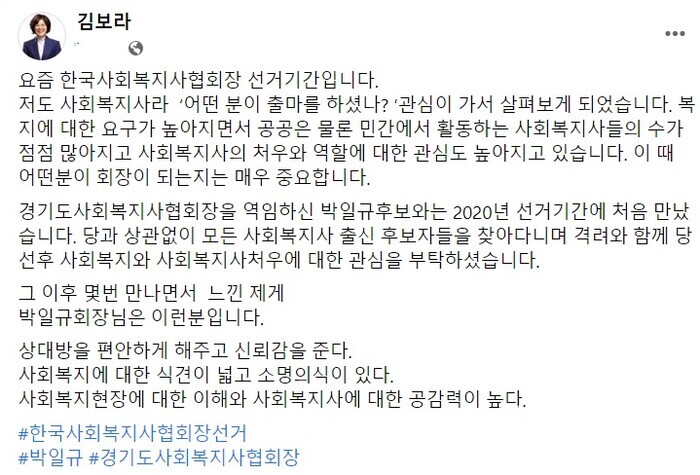 22일, 김보라 시장은 자신의 페이스북을 통해 “요즘 한국사회복지사협회장 선거기간이다. 저도 사회복지사라 ‘어떤 분이 출마를 하셨나?’ 관심이 가서 살펴보게 되었다”며 “복지에 대한 요구가 높아지면서 공공은 물론 민간에서 활동하는 사회복지사들의 수가 점점 많아지고 사회복지사의 처우와 역할에 대한 관심도 높아지고 있다. 이 때 어떤 분이 회장이 되는지는 매우 중요하다”고 말했다.