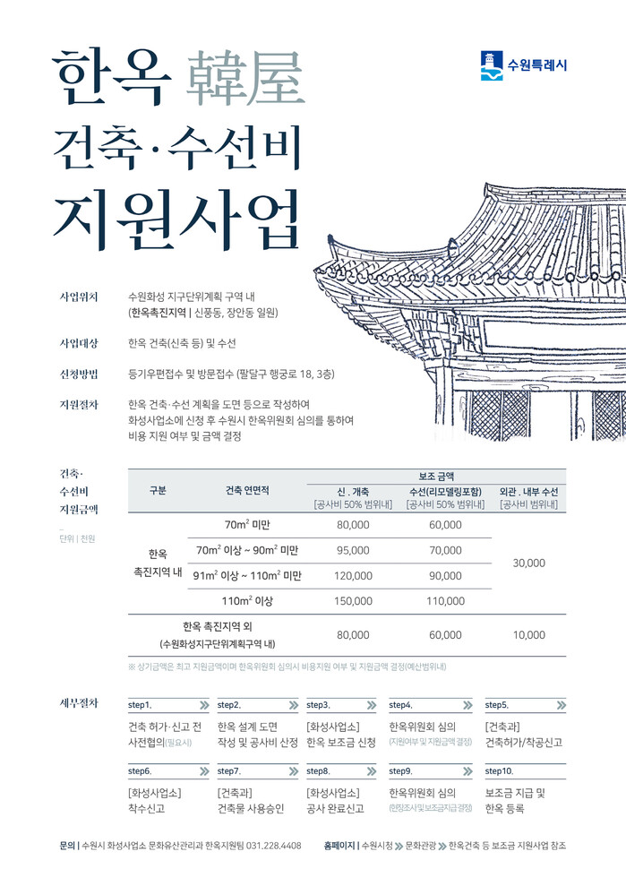 수원시 홈페이지(https://www.suwon.go.kr) 검색창에서 ‘2023년도 한옥 건축·수선비 지원사업’을 검색해 공고문을 볼 수 있다. 신청서를 내려받아 작성한 후 설계도면, 공사예상비용 견적서 등 서류를 첨부해 수원시 화성사업소 공공한옥팀으로 제출(등기우편·방문)하면 된다.