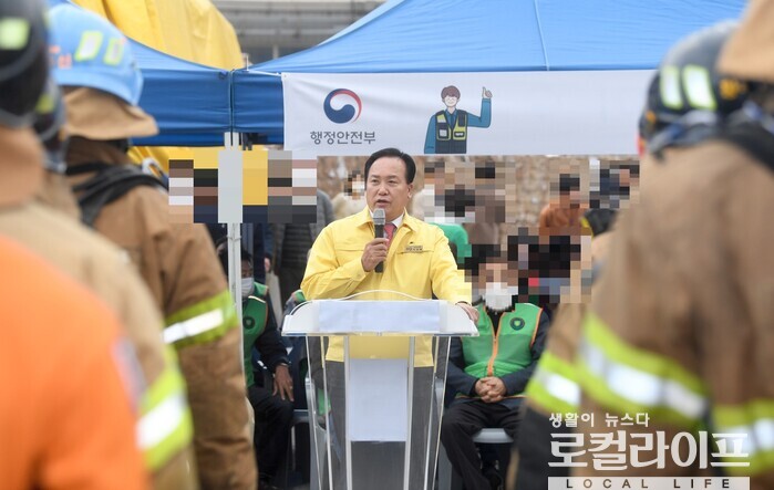 | ▲ 이권재 오산시장이 ‘대형화재 및 유해 화학물질 유출사고에 대비한 종합적인 대응역량 강화 현장 훈련’에서 인사말을 하고 있다. (사진출처=이권재 페이스북) |