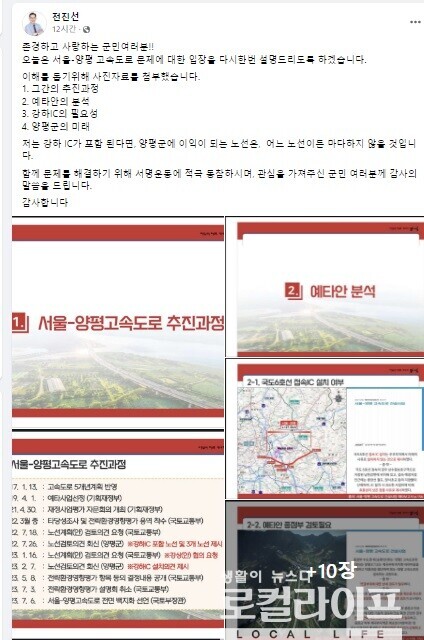 이날 전 군수가 게재한 자료는 ▲그간의 추진과정 ▲예타안의 분석 ▲강하IC의 필요성 ▲양평군의 미래 등의 테마로 한 자료들이다.