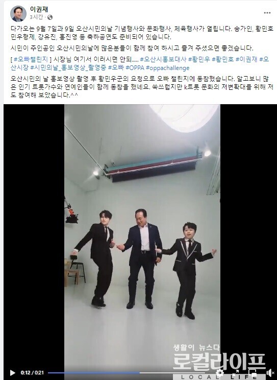이어 “시민이 주인공인 오산시민의날에 많은분들이 함께 참여 하시고 즐겨 주셨으면 좋겠다”며 영상과 함께 “[ #오빠챌린지 ] 시장님 여기서 이러시면 안되..... #오산시홍보대사 #황민우 #황민호 #이권재 #오산시장 #시민의날_홍보영상_촬영중 #오빠 #OPPA #oppachallenge ” 해시태그를 올렸다.