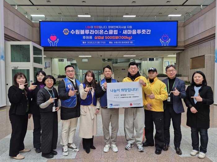 수원시 관계자는 “따뜻한 마음을 나눠주신 수원블루라이온스클럽과 새마을푸줏간에게 감사드린다”라며 “장애인분들의 복지 향상을 위해 지속해서 노력하겠다”고 말했다.