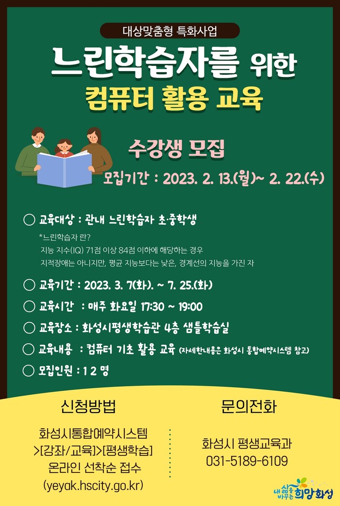 느린 학습자를 위한 컴퓨터 활용 교육에 관한 자세한 사항은 화성시평생학습관 홈페이지(https://u-life.hscity.go.kr)를 확인하거나 평생교육과(031-5189-6109)로 문의하면 된다.