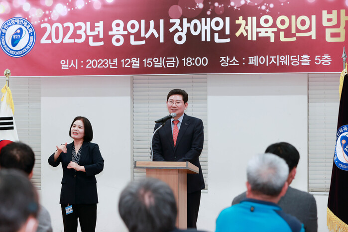 이상일 용인특례시장은 15일 저녁 처인구 유방동 페이지웨딩홀에서 열린 ‘2023년 용인특례시 장애인 체육인의 밤’ 행사에 참석해 장애인 체육인 등 관계자들을 격려했다.