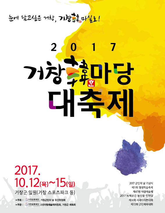 거창군은 '2017 거창 韓마당 대축제'를 10월 12부터 15일까지 거창스포츠파크 등 거창군 일원에서 개최한다고 밝혔다. 이번 한마당 대축제는 '눈에 담고 싶은 거창韓마실' 이라는 부제와 '거창韓 땡김이 있는 거창 축제로의 초대'라는 야심찬 슬로건을 내걸고 새롭게 태어날 예정인데 (재)거창문화재단과 군민의 날 추진위원회에서 공동 주최하고 (재)거창문화재단과 (사)아림예술제 위원회, 거창군 체육회, 사과마라톤조직위원회가 공동 주관한다.