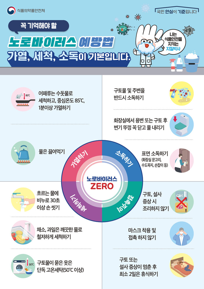 노로바이러스는 오염된 식품 섭취 시 2~4일이 지나 설사와 구토가 2~3일간 지속되며 낮은 발열, 탈수, 호흡기 증상을 일으키는 대표적인 바이러스 식중독균으로 전염성이 높은 질병이다.