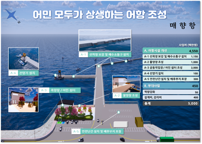 이에 시는 이번 사업으로 2025년까지 ▲선착장 보강 및 해수 소통구 설치 ▲물양장 조성 ▲공동작업장 및 어민쉼터 조성 ▲선양기 설치 ▲안전난간 설치 및 배후부지 포장 등을 추진할 계획이다.