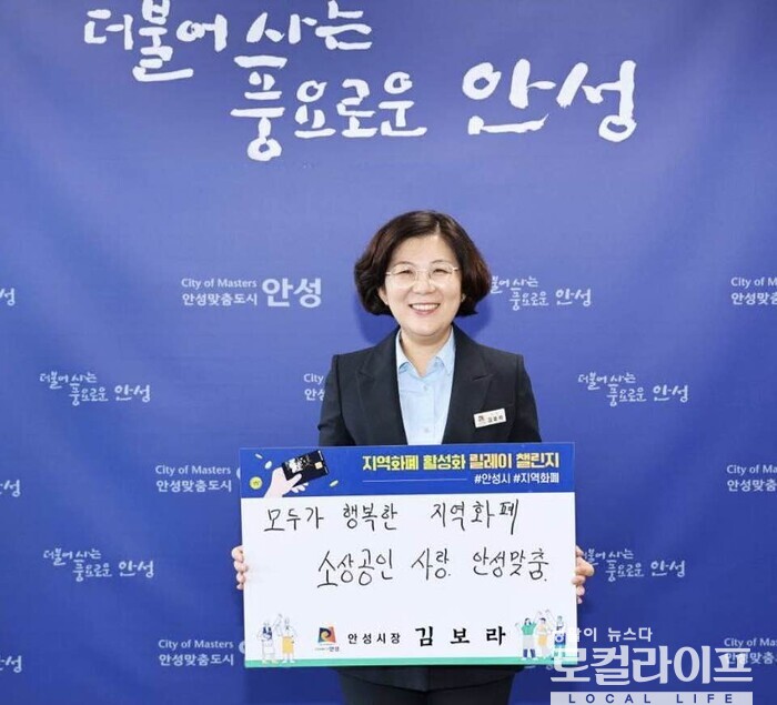 [안성=로컬라이프] 송준형 기자 = 김보라 안성시장이 ‘지역화폐 활성화 릴레이 챌린지’에 참여했다.