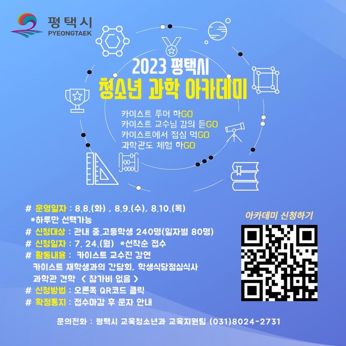 참여를 희망하는 학생은 ‘청소년 과학 아카데미’ 홍보 포스터에 있는 QR코드를 통해 신청할 수 있으며, 접수는 7월 24일 1일간, 0시부터이다.