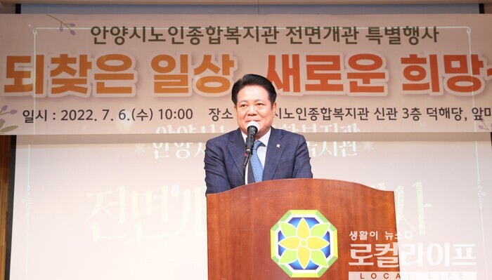 | ▲ 최대호 안양시장이 '안양시 노인종합복지관' 개관 행사에서 인사말을 하고 있다. (사진출처=최대호 페이스북) |
