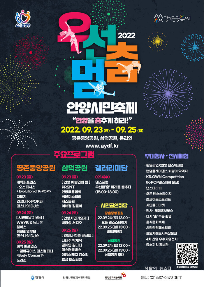 이어 “남녀노소 구분 없이 다 다 즐기는 여기는 안양시민축제~~~. 평촌 중앙 공원, 삼덕공원, 온라인까지 안양에서 즐기는 안양시민 축제 스우파도 스걸파도, 다비치도 노라조도 다 함께 즐기는 여기는 우선멈춤 안양시민축제이다”라며 “시민이 만들고, 참여하는 소통의 장. 안양시민축제가 9월 23일 금요일부터 25일까지 평촌중앙공원과 삼덕공원에서 다양한 공연과 행사와 부스로 시민을 맞이한다. 안양을 사랑한다면, 좋아한다면, 아낀다면 안양시민축제-우선멈‘춤’에서 안양을 춤추게 하시라”고 강조했다.