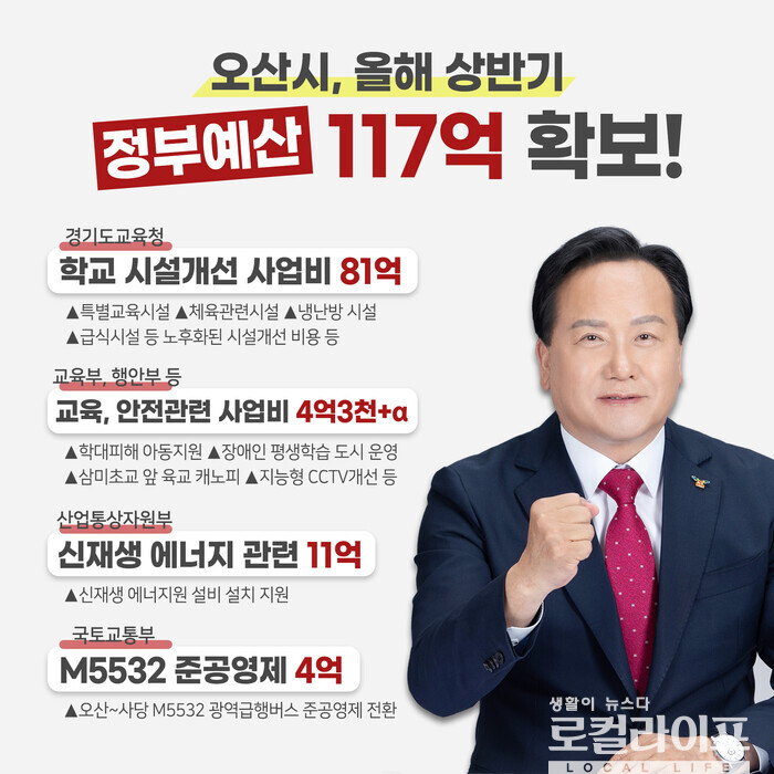 이와 관련해 이권재 오산시장은 19일, 자신의 페이스북에 <오산의 미래 위한 예산확보 더욱 총력>이라는 제목의 글을 올려 “오산시는 올 상반기만 총 37개 사업에서 117억 규모의 지역맞춤형 정부예산을 확보했다”며 “이중 안전과 교육환경 개선에 중점을 둔 초·중·고 관련 예산이 총 92억 가량이다”라고 밝혔다.