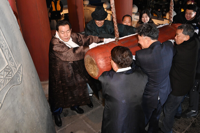 이재준 수원특례시장, 김기정 수원특례시의회 의장을 비롯한 시의원, 시민 대표 등이 20여 분 간 타종했다.