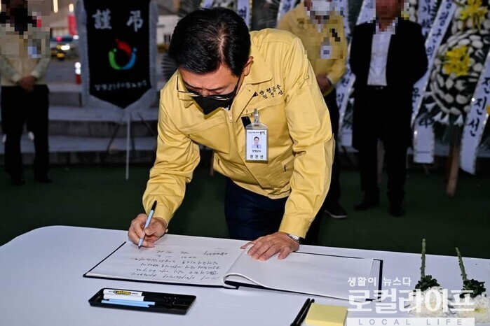 | ▲ 전진선 양평군수가 ‘이태원 사고 사망자 합동분향소’를 찾아 조문 후 방명록을 작성하고 있다. (사진출처=전진선 페이스북) |