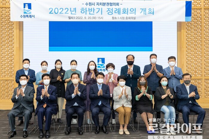 | ▲ 이재준 수원특례시장(앞줄 왼쪽에서 세번째)이 '수원시 자치분권협의회 2022년 하반기 정례회의' 후 기념촬영을 하고 있다. (사진출처=이재준 페이스북) |