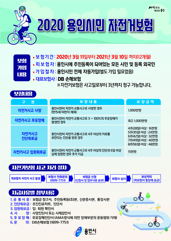 시민 이 모씨는 2019년 10월 처인구 김량장동에서 자전거를 타고 가다 차량과 충돌하여 사망했다. 이 모씨의 자녀들은 용인시 자전거보험이 있다는 사실을 알고 보험금을 신청해 1350만원을 지급 받았다.