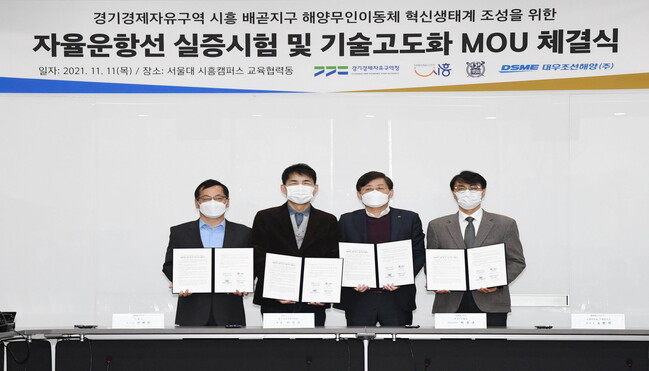 시흥시(시장 임병택)는 지난 11일 서울대 시흥캠퍼스 교육협력동에서 경기경제자유구역청, 서울대 시흥캠퍼스본부, 대우조선해양(주)과 ‘시흥 배곧지구 내 해양 무인 이동체 혁신 생태계 조성을 위한 자율운항선 실증시험 및 고도화 양해각서(MOU)’를 체결했다.