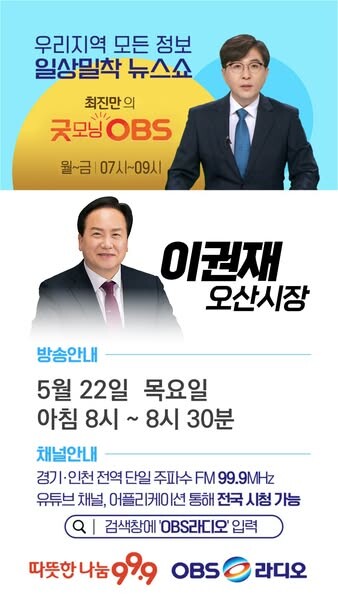 [오산=로컬라이프] 송준형 기자 = 이권재 오산시장은 5월 22일(목) 오전 8시부터 8시 30분까지 OBS 라디오<굿모닝 OBS>에 출연해 오산시의 주요 시정 현황과 문화 축제를 생방송으로 소개할 예정이다.