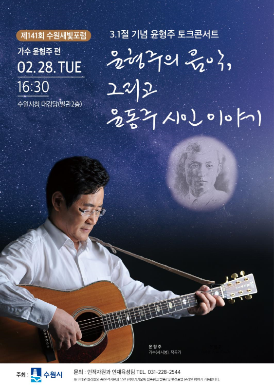 수원시가 세시봉의 윤형주를 초청해 그의 노래와 윤동주 시인의 이야기를 담은 토크콘서트 ‘제141회 수원새빛포럼’을 2월 28일 개최한다.