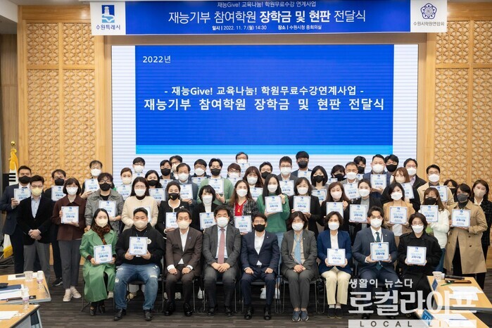 | ▲ 이재준 수원특례시장(맨앞줄 왼쪽에서 세 번째)이 '재능기부 참여학원 장학금 및 현판 전달식'에서 기념촬영을 하고 있다. (사진출처=이재준 페이스북) |