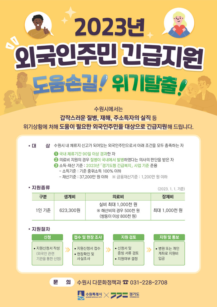 ‘외국인주민 긴급지원’은 수원시에 거주하는 외국인 주민이 갑작스러운 질병이나 사고 등으로 위기에 처한 경우, 생계비‧의료비‧장제비 등을 신속 지원하는 사업이다.