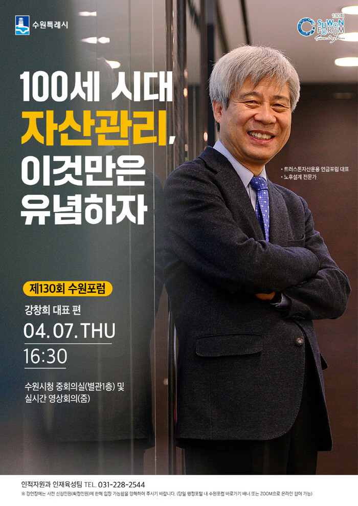 수원시가 ‘100세 시대 자산관리, 이것만은 유념하자’를 주제로 제130회 수원포럼을 연다.