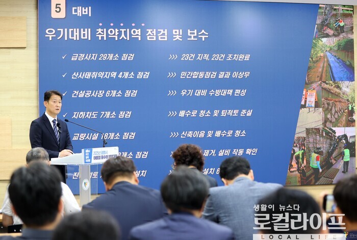 매년 우기 전 급경사지, 산사태 취약지역, 건설공사장, 지하차도, 우수관리시설 등 취약지역과 시설물을 사전 점검하고 문제 발견 시 즉각적으로 조치하고 있다.