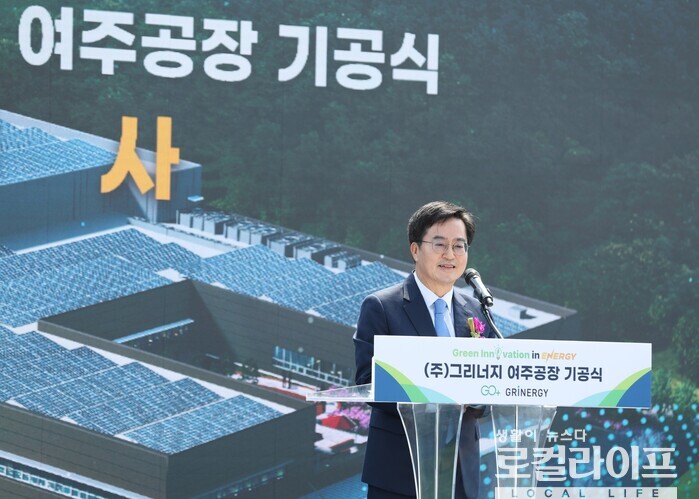 | ▲ 김동연 경기도지사가 ‘(주)그리너지 여주공장 기공식’에서 축사를 하고 있다. (사진출처=김동연 페이스북) |