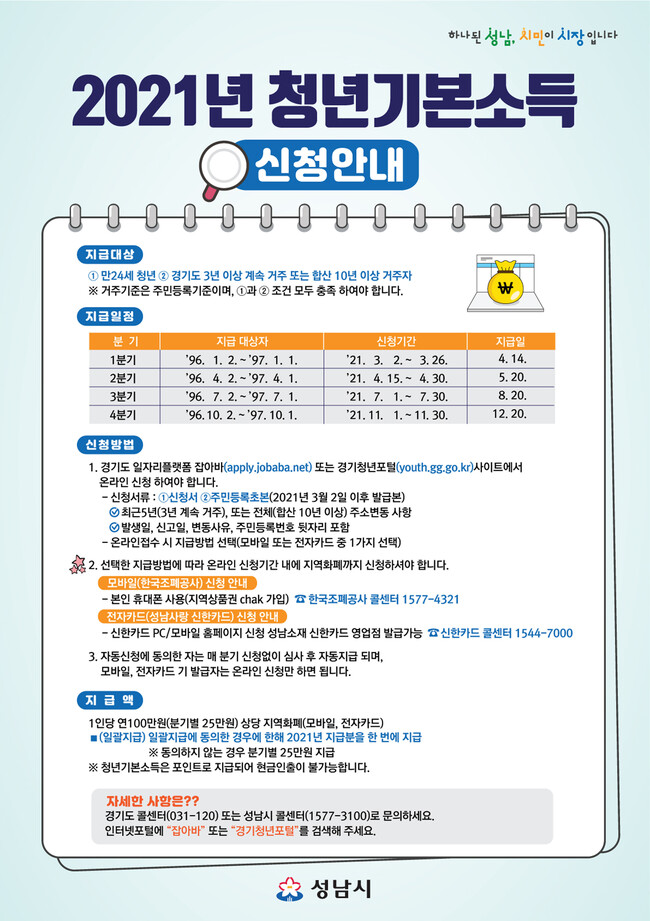 사진/2021년 청년기본소득 신청 안내 리플릿