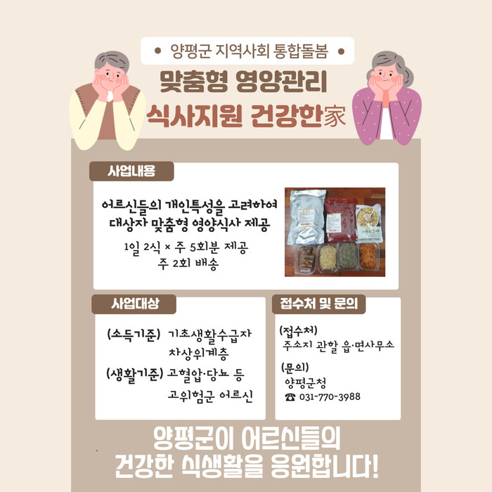 선정된 사업은 6월 행정안전부에서 예산을 교부받아 진행 될 예정이며, 군은 해당 예산을 통해 기존 ‘맞춤형 영양관리 식사지원 건강한 家’ 사업의 서비스 품질을 향상시키고, 정기적인 배송으로 보다 안정적인 식사지원 시스템을 마련할 수 있을 것이라 기대하고 있다.