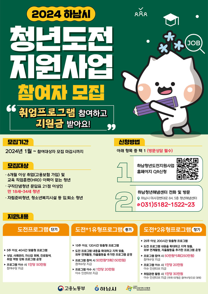 하남시(시장 이현재)가 취업에 어려움을 겪고 있는 청년들을 지원하는 ‘2024년 청년도전 지원사업’을 추진한다.