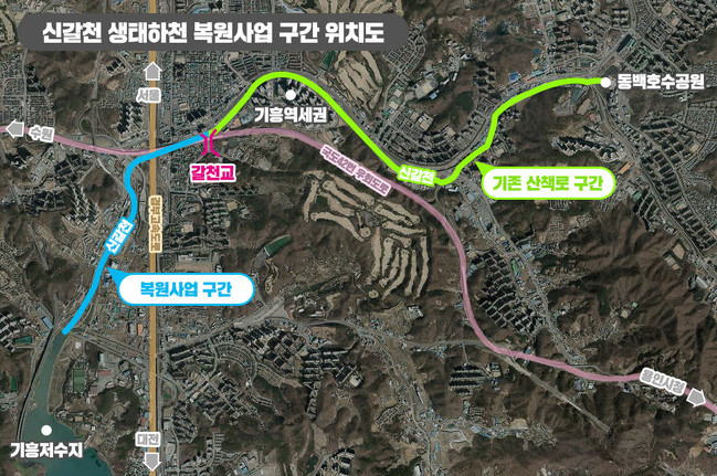 신갈천의 상류 부분인 동백호수공원에서 상갈파출소까지는 약 5km의 산책로가 이미 조성돼 있으며 하류의 상갈파출소에서 기흥호수공원에 이르는 2.5km 구간이 아직 연결되지 않은 상태다.