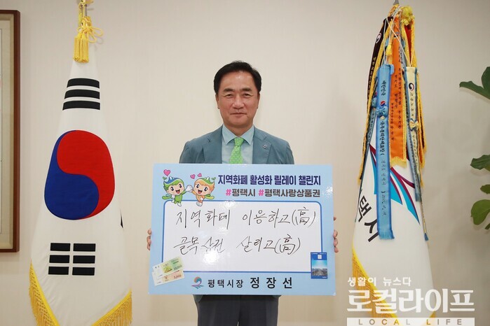 [평택=로컬라이프] 송준형 기자 = 정장선 팽택시장이 ‘지역화폐 활성화 릴레이 챌린지’에 동참했다.