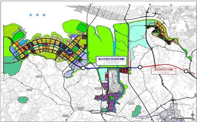 동서진입도로는 지난 2012년 6월부터 총 사업비 2천8백억 원이 투입됐으며, 6~8차선으로 개설됐다.