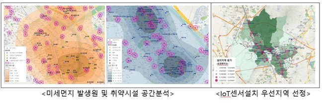 시는 최근 국토교통부와 한국산업단지공단 등에 수집된 12종의 데이터를 활용해 버스정류소 주변의 유동인구, 미세먼지 발생원, 취약계층 이용시설 데이터 등을 분석한 결과를 바탕으로 미세먼지 측정 IoT센서 설치 우선지역을 선정할 계획이다.