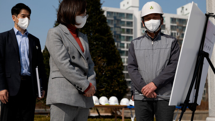 사진/은수미 성남 시장이 소음저감시설 공사 진행상황에 대해 듣고 있다(사진제공=성남시)