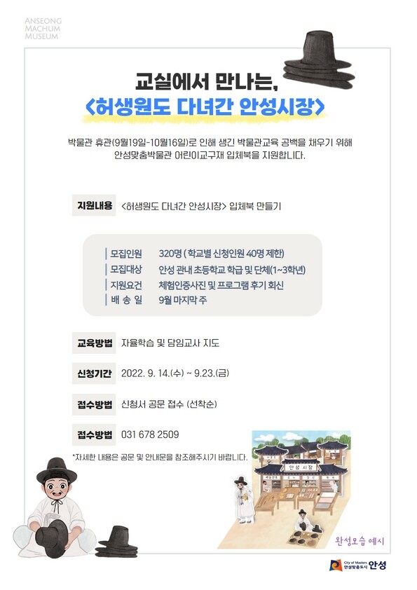 안성시 안성맞춤박물관에서는 9월 14일부터 23일까지 관내 초등학교를 대상으로 2022년 <허생원도 다녀간 안성시장> 교구재 지원 신청을 모집한다.