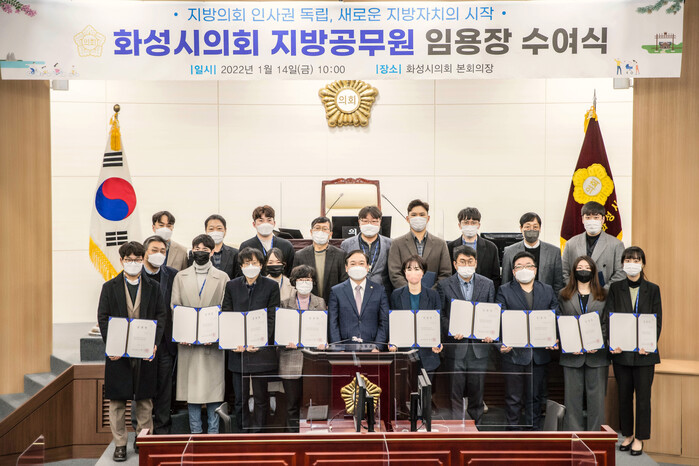 화성시의회 원유민 의장은 14일 시의회 본회의장에서 인사권 독립 후 첫 의회 소속 공무원 22명에게 임용장을 수여하였다.