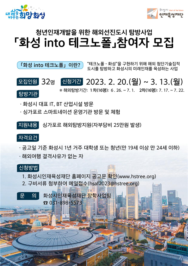(재)화성시인재육성재단이 해외 첨단산업 도시 탐방 프로그램 ‘2023년 화성 into 테크노폴’에 참여할 지역 청년을 모집한다.
